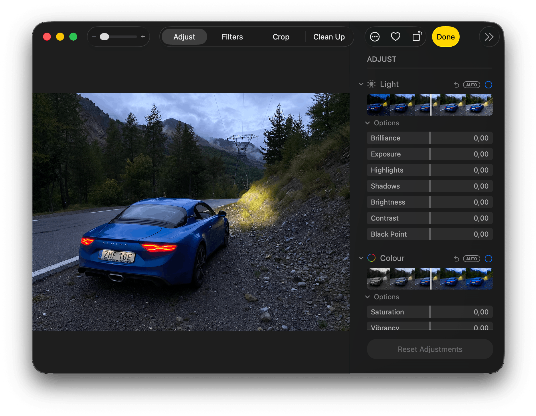 A Volvo stuck in the snow is less awesome than the previous photo, but oh well. I need to edit it, so I press H on my keyboard to bring up the adjustments HUD. I’m still exactly where I was, but now I have editing controls. There’s no step three!