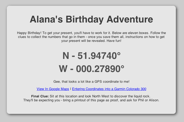 So, on Tuesday morning I wake up, make excuses about having to to work on her birthday and screech out of the house. Instead of going to work, I’m driving around mid Bedfordshire attaching clues to things hoping my girlfriend doesn’t catch up with me.