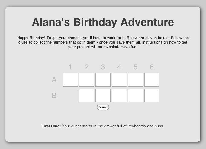 Now to the fun part. The web page is a simple PHP page that takes in the numbers and saves them in a cookie. When all the numbers are entered correctly, the form would be replaced with instructions and a final clue.