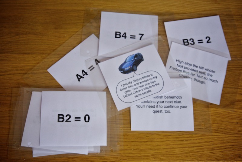 Now it’s time to make and hide the cards. The five clues inside the house were hidden inside drawers and scanners and things just so they weren’t stumbled upon while looking for another clue. However, once outside you don’t want to spend ages searching through the wrong bush so the cards were fairly open once you figured out the previous clue and got to the right place. Two of the clues were fairly close together in our village of Clifton, and two others were in the Chicksands woods nearby.