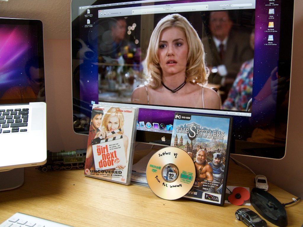 Come Monday, Amazon’s delivery arrives, and I’m now the proud owner of official copies of both The Girl Next Door and The Settlers. Included in the photos are both my downloaded copy of the film (playing in iTunes) and The Settlers, on a DVD-R.