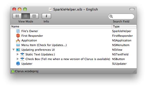 All this does is check if the SUUpdater class, used by Sparkle, exists. If it does, it loads the nib file containing my “Check for Updates…” menu item into an IBOutlet and the chunk of UI to be placed into the Preferences window into the view controller’s view property. Below is code copied and pasted from Clarus itself — applicationMenu is an IBOutlet to the Application menu, and updatesView is an IBOutlet to a view in the Preferences window that should contain the self-updating UI.