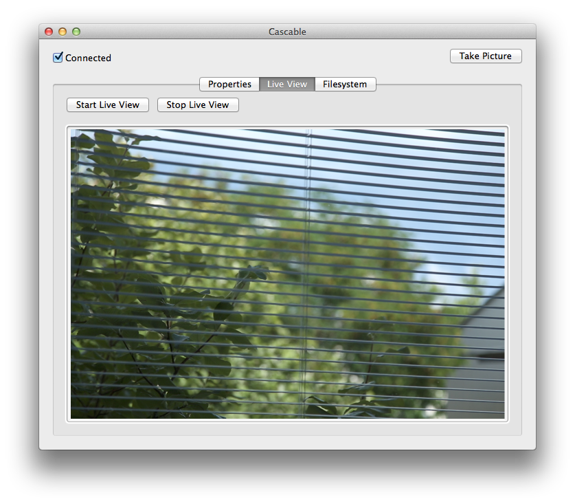 After a couple of weekends with Wireshark and Xcode, I had an Objective-C framework with a reasonably complete implementation of the PTP/IP protocol — enough to get and set the various properties of the camera, stream the live view image, perform commands and interact with the filesystem.