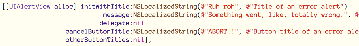 There are various merits to both approaches, and I’m not here to argue which one is best. In my world, at work we use approach #2 because our localisation process kinda requires it, and I use #2 in personal projects because, well, seeing user-facing language in .m files gives me the heebie-jeebies — those files are for computer language, not people language.