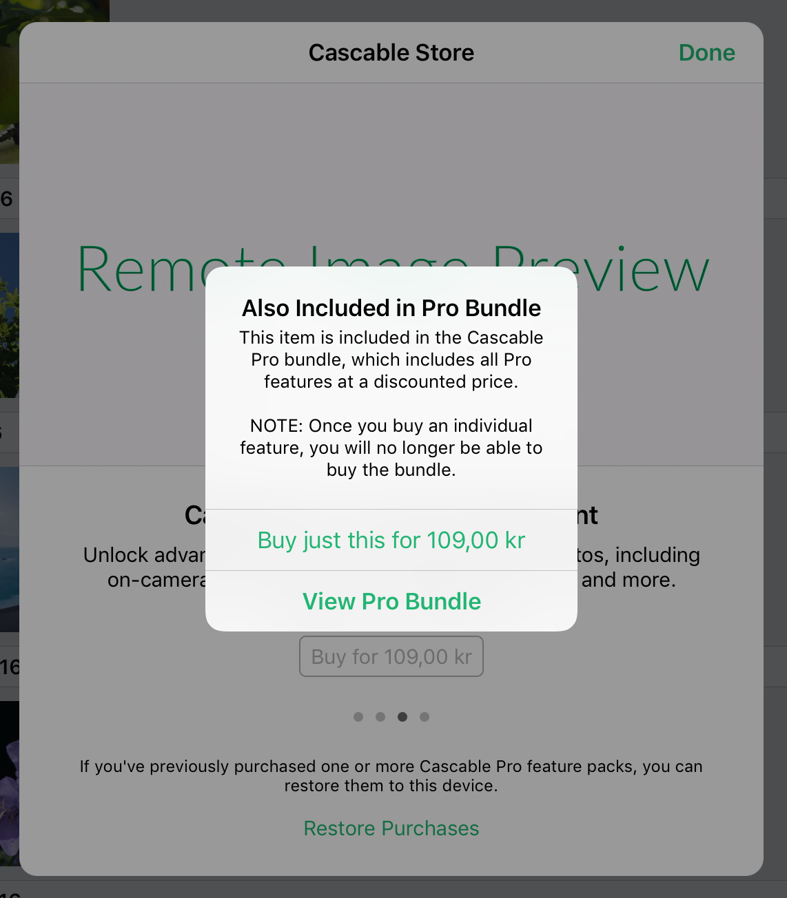 This is where we get a chance upsell the user to the more expensive (but better value for money) purchase. If the user taps “View Pro Bundle”, the purchase will be cancelled and they’ll be shown the video and description of the bundle. Otherwise, the purchase of the requested item will continue.