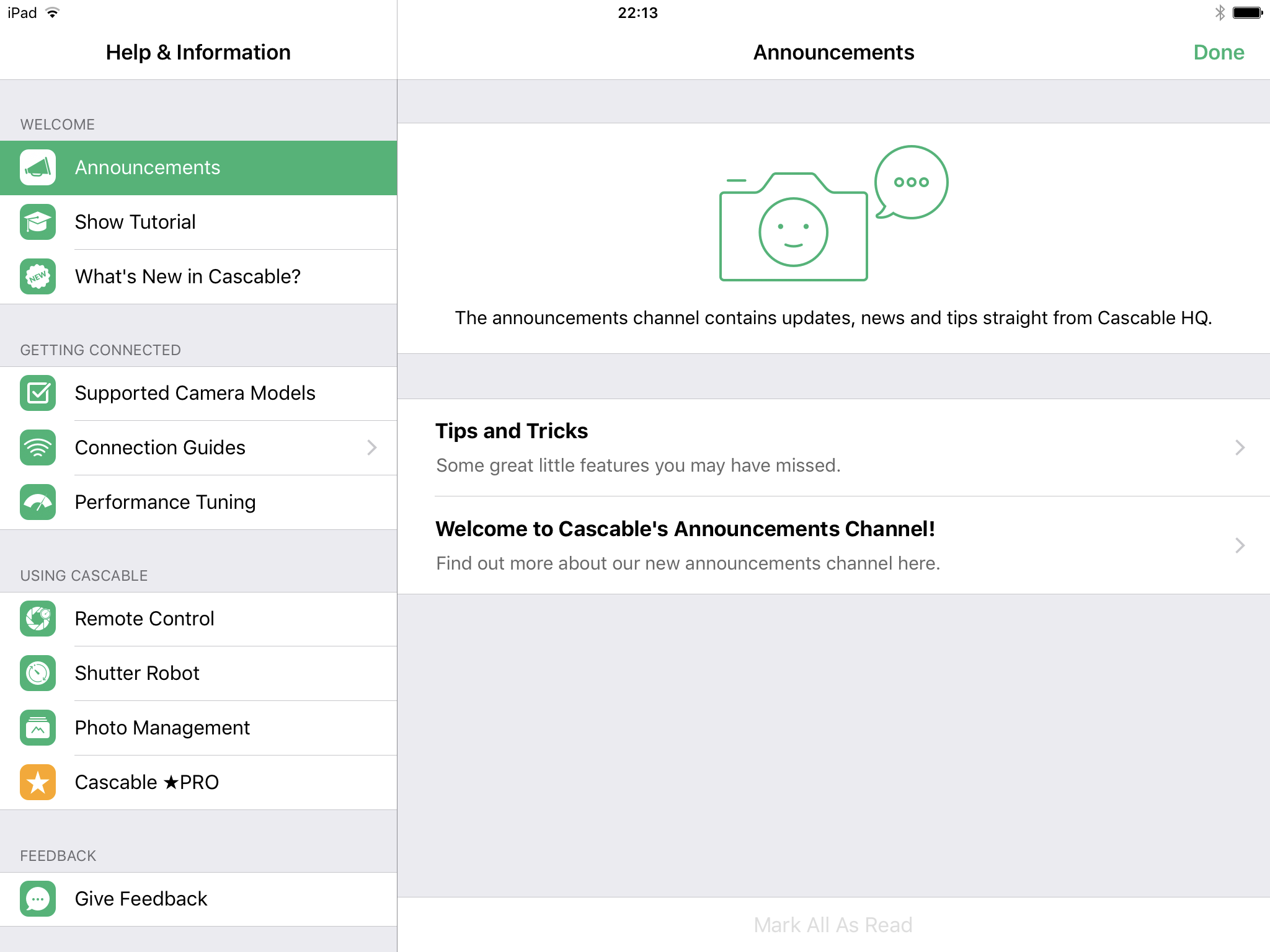 We recently shipped an update to Cascable that adds an “Announcements Channel”. This allows us to publish content online for presentation to users inside the app. We’re trying to make this visible to the user without being annoying — no push notifications, no noises, no alerts. Hopefully the little unread indicator won’t be too abrasive to our users.