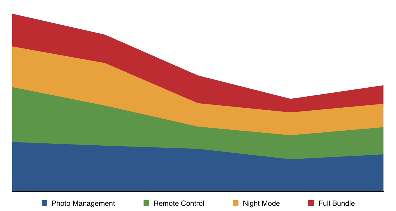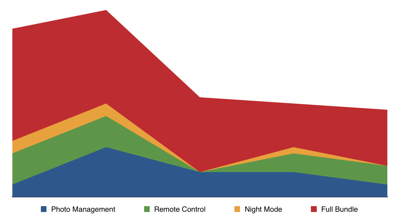 This graph shows the Entry Point to the In-App Purchase store within Cascable - that is, the product they first see when the store is shown to them. Once they’re in the store, users can swipe left and right to browse all the available options, but the data for that isn’t graphed here. As you can see, the entry point is reasonably evenly spread between the three individual $10 unlocks, with the $25 bundle coming in last. This is because the only way to see the bundle first is to navigate to the “Purchases” item in Settings and tap the button next to the bundle. The rest are encountered when using the app normally.